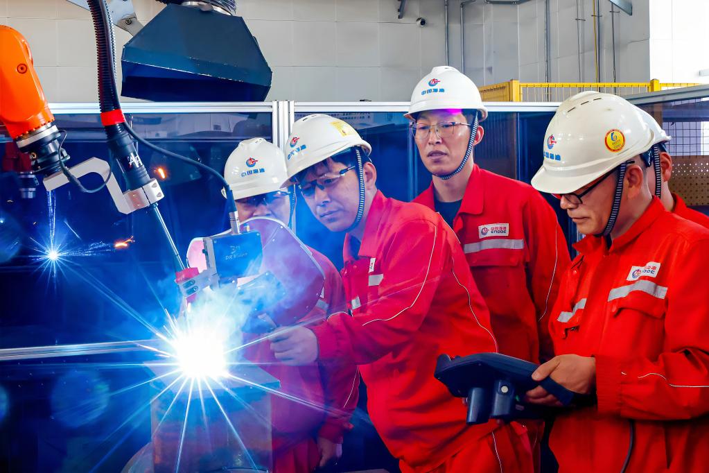 2025年4月29日,正在海油工程天津智能化制制,刘海林(左二)和同事调试一台焊接机械人。发(杜鹏辉 摄)。